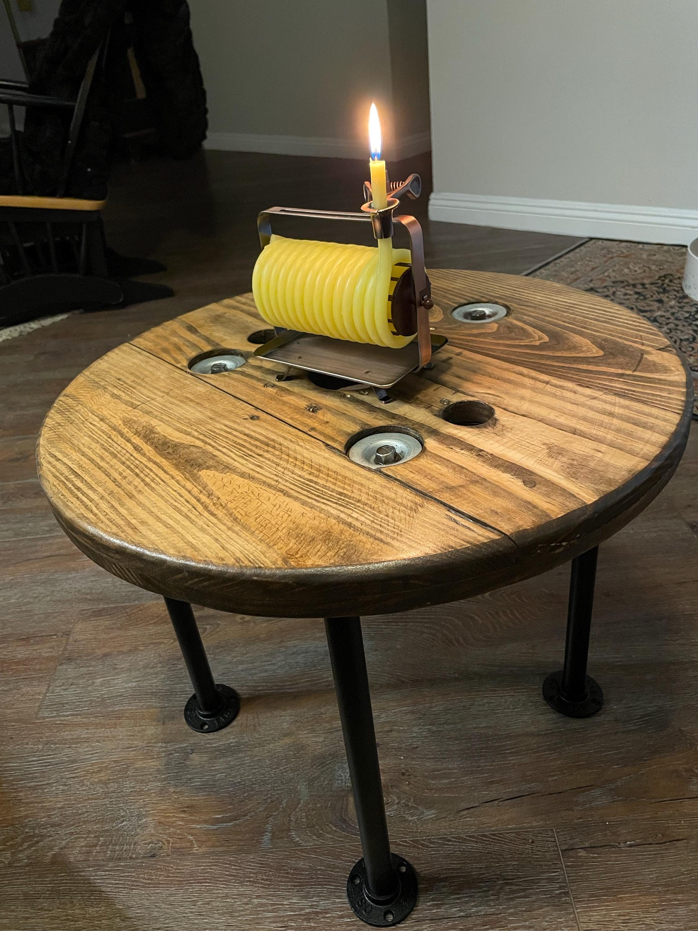Handcrafted from authentic industrial wooden spools, our custom farmhouse spool tables are built to make a statement. Whether you're decorating a cozy living room, a modern farmhouse porch, or a rustic cabin kitchen, this industrial-style table is personalized to fit your vibe.