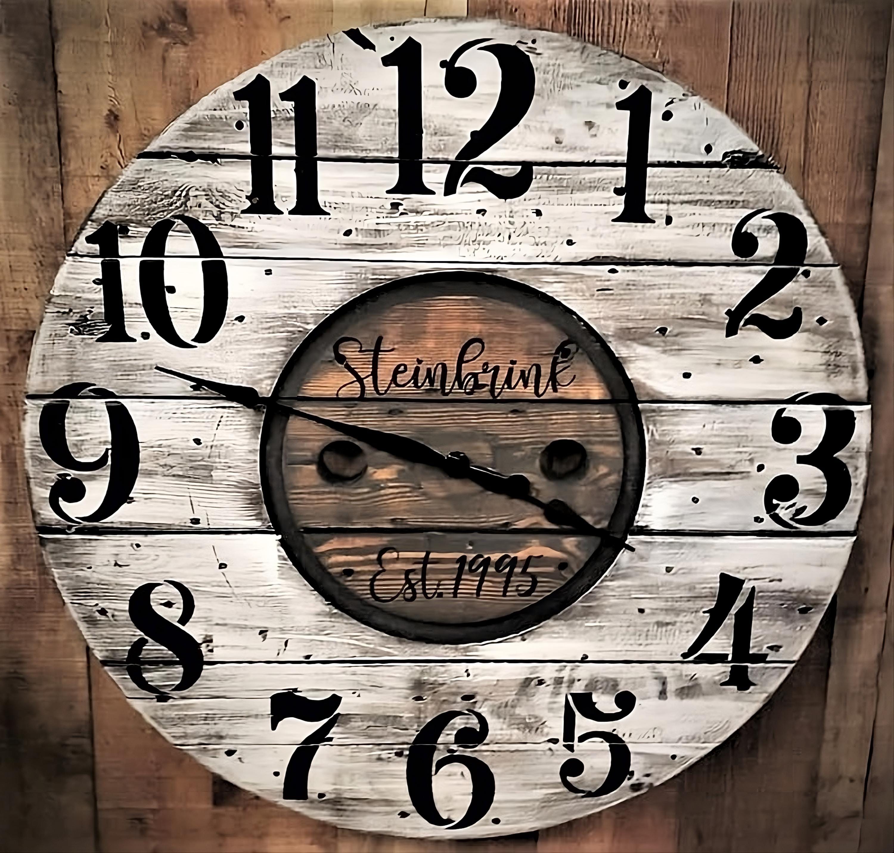 Each clock is a one-of-a-kind piece, featuring natural wood grain, knots, cracks, and character marks from its industrial past. We’ll handcraft your design to bring your vision to life — no two clocks are ever the same!